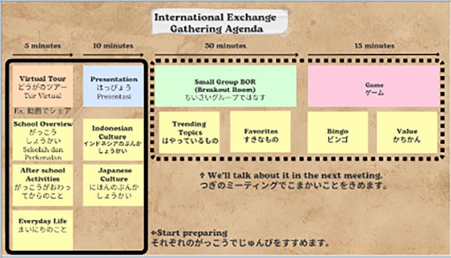 企画準備では、日本側の生徒にも、インドネシア側の生徒にも楽しんでもらえるような企画を考え、形にするために力を合わせて頑張りました。みんなに楽しんでもらえるゲームやテーマを探すのは大変なことでしたが、文化や言語の違い、考え方や価値観の違いを尊重し合い、企画を練り上げることができたことは大きな成長に繋がったと感じています。