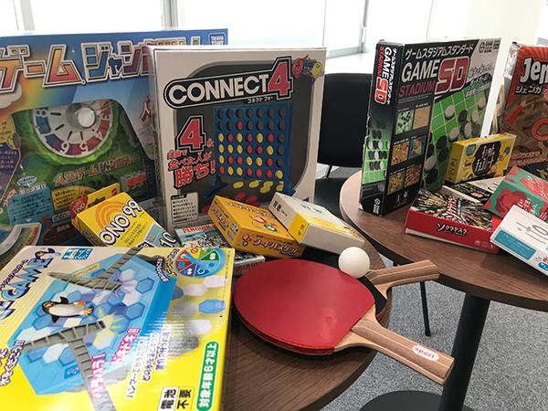 ボードゲームは、ベーシックなトランプから、昨年度から人気のある「ジェンガ」、卓球セットなどが置かれています。