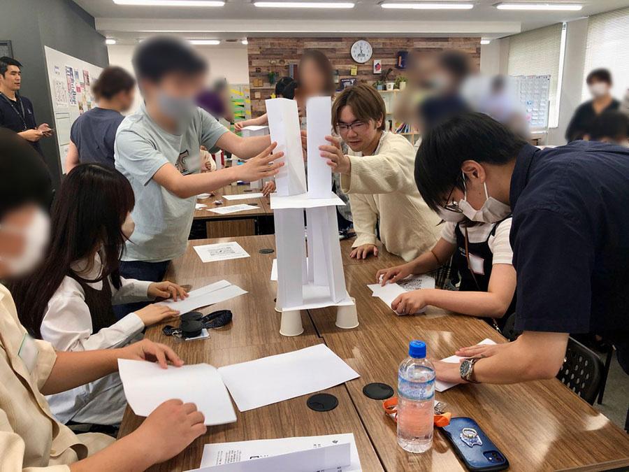 また、今回は、生徒同士の関係構築の際に行っているペーパータワーのワークを体験していただきました。