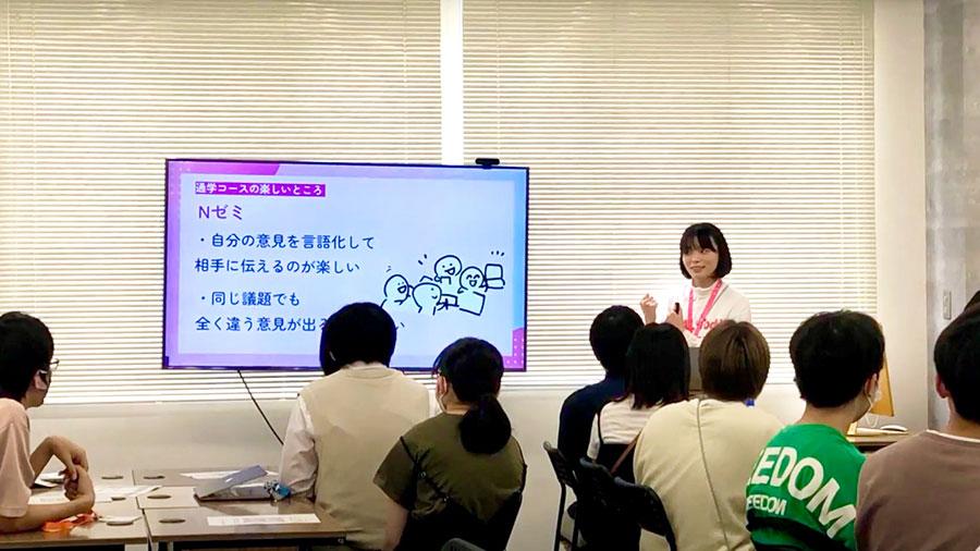 写真の場面では、通学コースの楽しいところとして「Nゼミ(※1)」や放課後の活動を紹介したり、通学コースのいいところとして「友だちがつくりやすい」「メンターとの距離が近い」といったことを紹介していました。