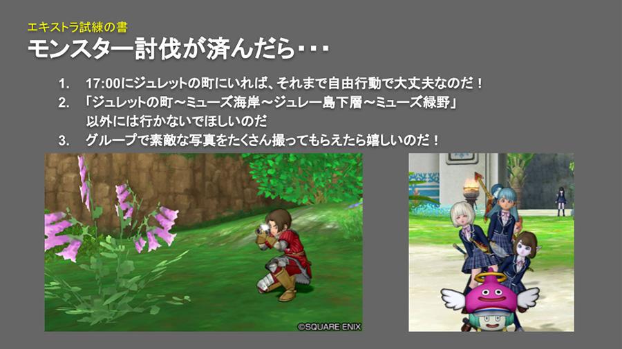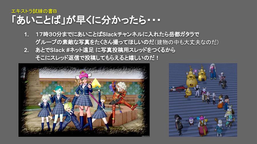 今回のネット遠足では、『ドラゴンクエストX オンライン』の世界だからこそできるモンスター討伐や謎解きのほか、Slack(角川ドワンゴ学園で使用しているコミュニケーションツール)とゲームの両方を活用して、全参加者が同時に共通体験をできる場面が設けられました。
