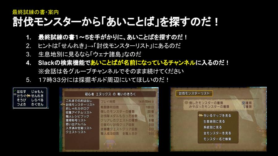 その書によると、討伐したモンスターを手がかりに「あいことば」を見つけ、これまで別々の班で動いていた参加者たちが全員1つのSlackチャンネルに集まることになるようです。