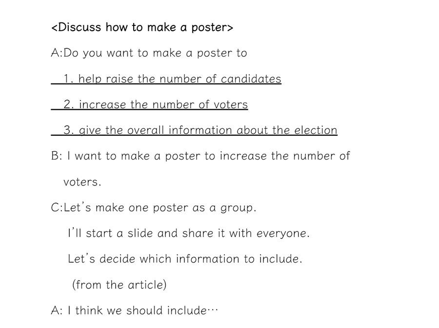 今回は海外の政治家に関する記事を扱った後に生徒会役員選挙をテーマにした授業に移行したため、政治や選挙に関する単語や表現に少し親しんだ上で取り組むことができました。