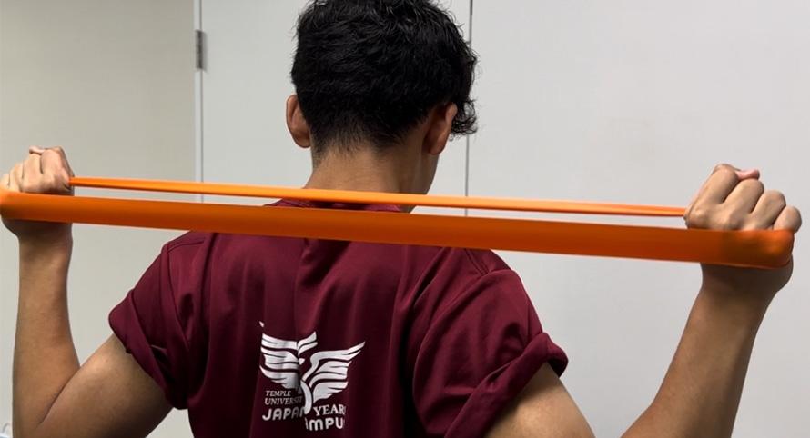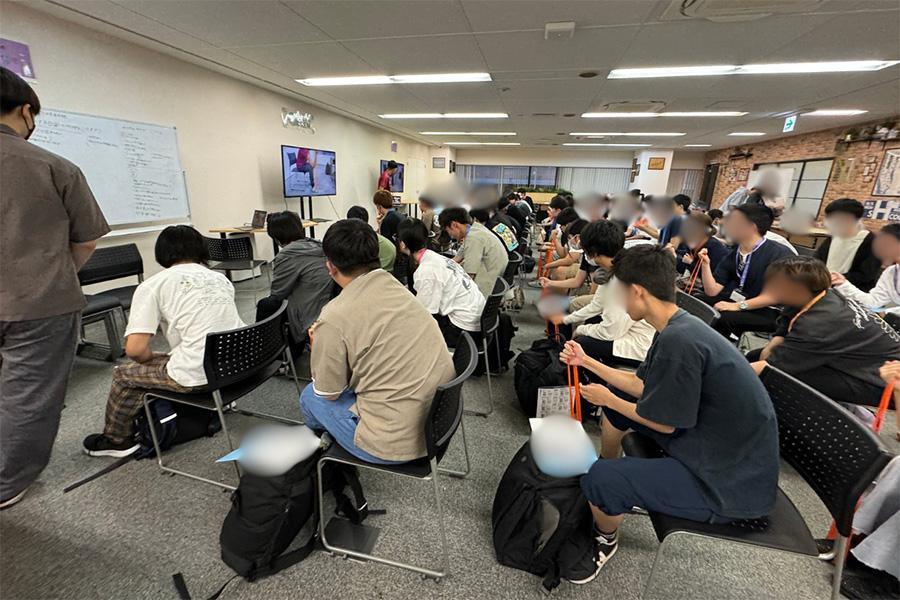 筋トレ体験会では参加者全員にトレーニングチューブと呼ばれる筋トレ器具を1人1つ配り、筋トレが初めての方でも、簡単に効果が出るトレーニング方法の動画を用意し、一緒に見ながらみんなで筋トレをしていきました。