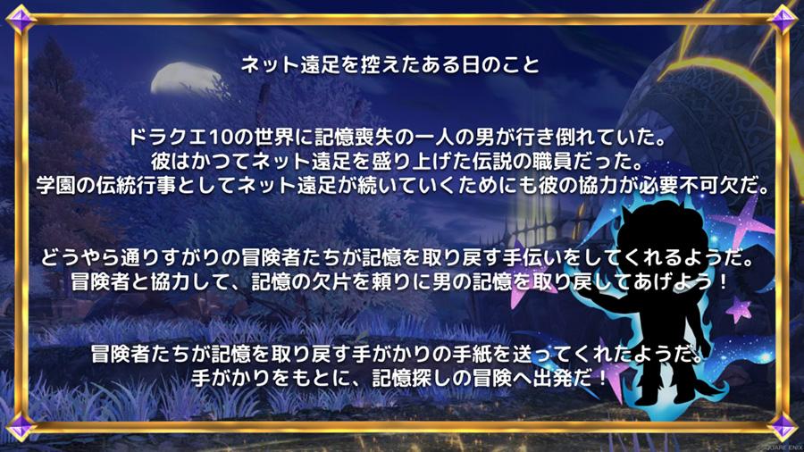 ※ ネット遠足とは…株式会社スクウェア・エニックスが運営する『ドラゴンクエストX オンライン』の世界の中でN/S高生と教職員が一緒に旅をしたり、レクリエーションをしながら、教職員と生徒、また生徒同士の交流を深めるきっかけとして開催されているN高等学校・S高等学校の行事です。