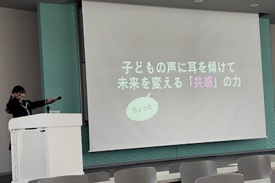 私の発表テーマは「子どもの声に耳を傾け、未来を『ちょっと』変える共感の力」です。今回のテーマは「共生社会」「共感力」を掲げていて、私がこれまで探究してきた「子どもの意思はなぜ届きにくいのか」という問いと深く結びついていました。