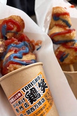 1階には様々な飲食店があり、テイクアウトをすることができます。おにぎりやサンドイッチ、ソフトクリームなどを買って、外で一緒に食べました。溶けてしまうソフトクリームに苦戦したり、万博カラーの赤(ケチャップ)と青(マヨネーズ)のソースをかけた唐揚げに「視覚と味覚が混乱する!」と盛り上がったり、楽しい時間を満喫しました。