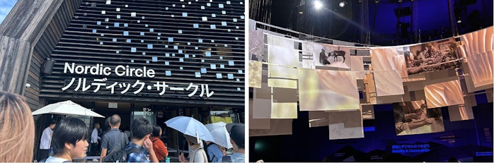 どこも混雑する中、比較的入りやすかった「ノルディック・サークル」に入館。ここは北欧5カ国(デンマーク、フィンランド、アイスランド、ノルウェー、スウェーデン)の共同パビリオンで、建物の一面に広がる写真やプロジェクションマッピングを通じて、サステナブルな取り組みが紹介されていました。特にスクリーンが廃棄予定のお米で作られたライスペーパーだと知り、早速サステナビリティを実感しました。突発的に入ったパビリオンでしたが、「本気で北欧に住みたい!」と言い出すメンバーがいるほど魅力的でした。