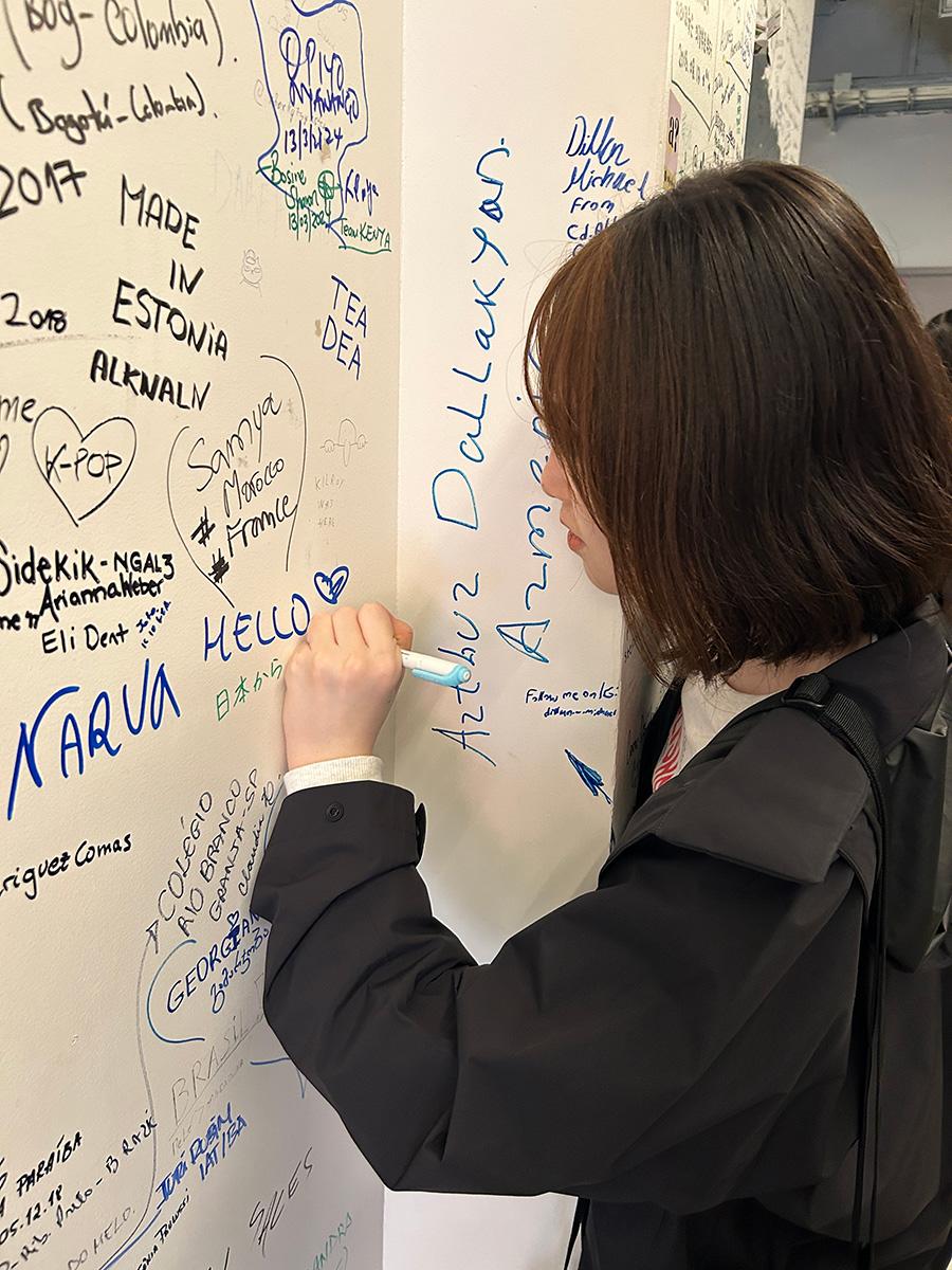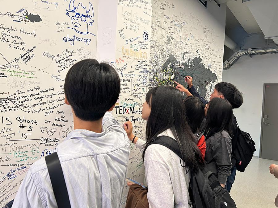 壁に描かれた大きな世界地図には、世界各国から施設を訪れた人々が書き込みをしており、参加者も訪問した記録を残すために書き込みを行いました。