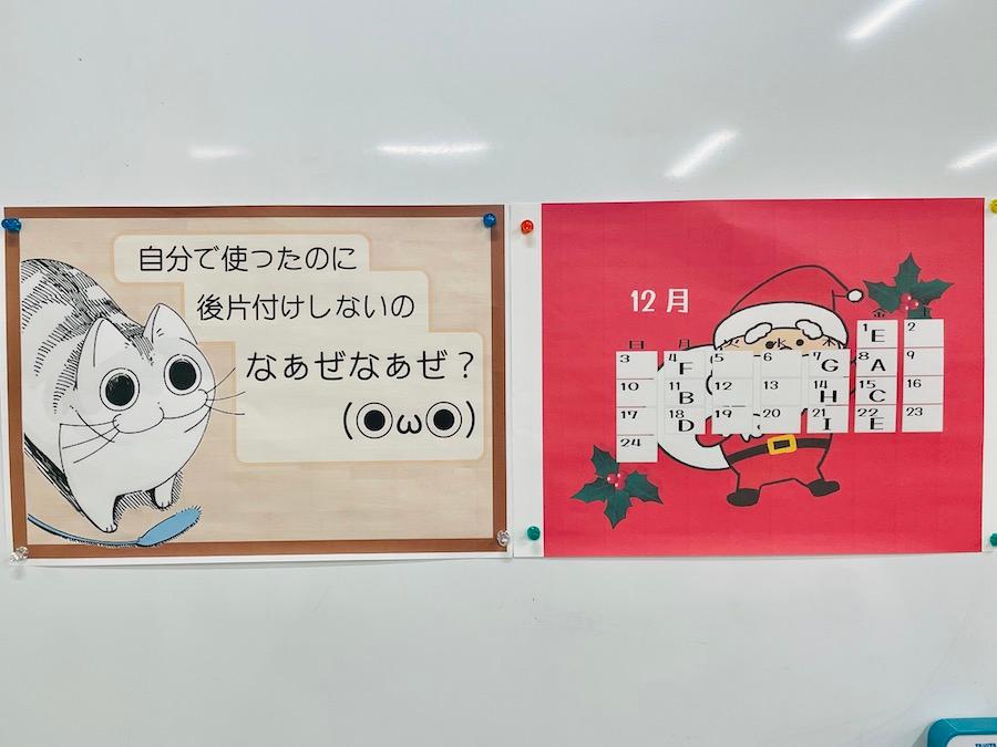 教室をきれいに保つためのスローガン決めや、毎月の清掃カレンダー制作をしたり、日々の生活で気になった汚れについて議論をしたりして、きれいなキャンパスの維持を目指しています。