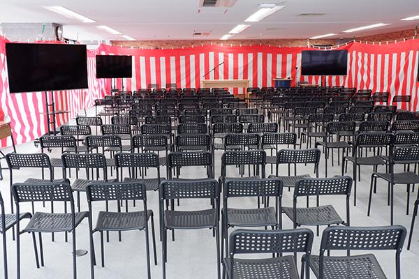 普段のキャンパスは、レンガ模様の壁紙におしゃれな小物がたくさん配置されたカフェのような空間なのですが、今回は新生活へのスタートを刻む大切な会、いつもより特別感を出そうと考えました。座席を整然と並べ紅白幕を張り巡らせて会場をつくり終えると一気に式典らしくなりました。