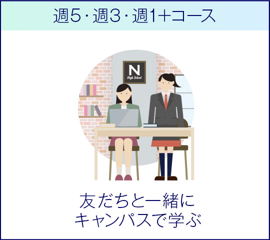 N高グループの生徒はネットとリアルを組み合わせ、自分の学習リズムや過ごしたいキャンパスライフに合わせて学び方を選択できます!友人と一緒に学びを進めたい生徒は週5~1日通学して、オリジナルカリキュラムを学習するコースを選択することもできます。