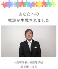 これまで頑張ってきたことやこれから挑戦したいことを入力すると、AIが生徒一人ひとりにカスタマイズされた「オリジナルの学校長式辞」を自動生成します。生成された式辞は奥平博一校長(N高等学校・R高等学校)の声と生成動画で読み上げられ、自分だけの特別なエールを受け取ることができます。