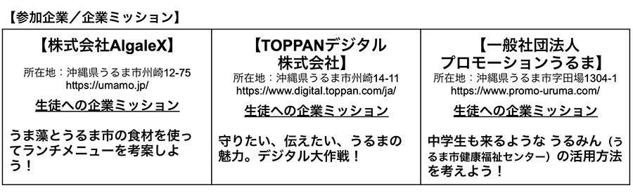 このたび、12月23日(火)、生徒が約4か月かけて考案したうるま市の魅力発信企画の「お試しモデル」発表会を開催します。発表会では、生徒が企業から提示された“企業ミッション”に基づき企画した地域活性化施策をプレゼンテーションします。当日は、各企業ミッションを提示する株式会社AlgaleX、TOPPANデジタル株式会社、一般社団法人プロモーションうるまの担当者をゲストに迎え、生徒の発表に対して総評・アドバイスをいただきます。