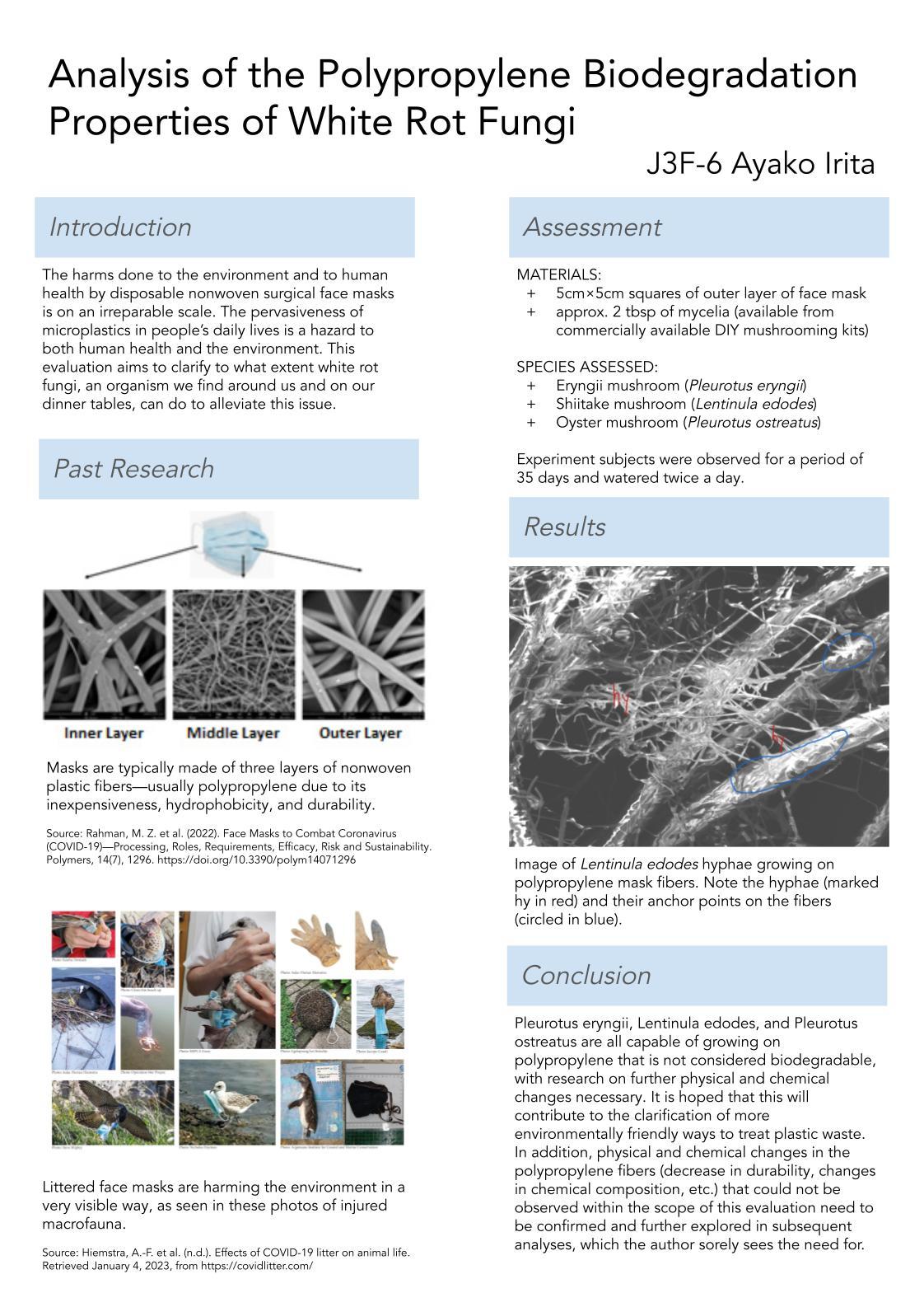 昨年度は「白色腐朽菌に属する食用キノコ類のポリオレフィン類を生分解する能力」をテーマに中学校の卒業論文を英語で書き、学内で論文発表Top 10に入りました。