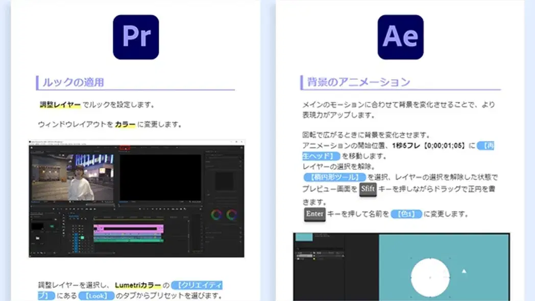 テキストはN高グループ生のためだけに作られたオリジナル教材。Premiere ProとAfter Effectsの基本的な使い方から、実践的な内容まで網羅します。