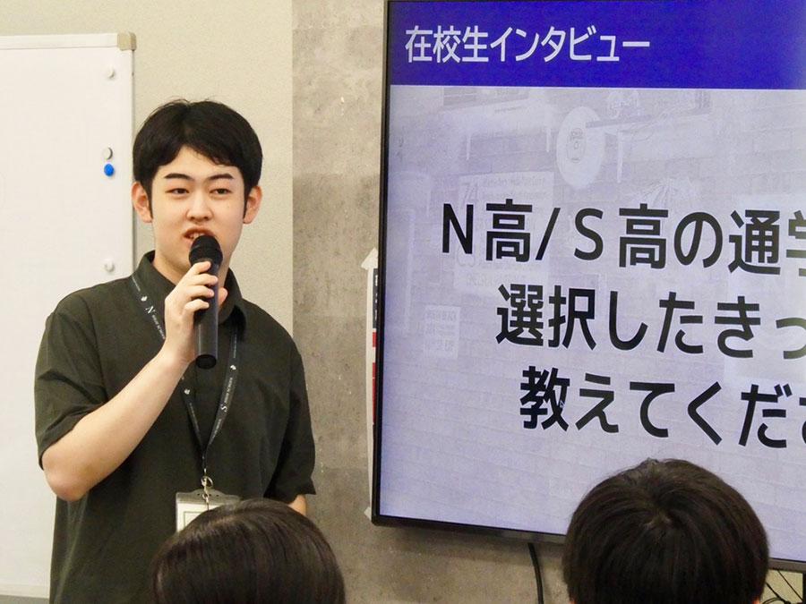 写真の場面では、通学コースの楽しいところとして「Nゼミ(※1)」や放課後の活動を紹介したり、通学コースのいいところとして「友だちがつくりやすい」「メンターとの距離が近い」といったことを紹介していました。