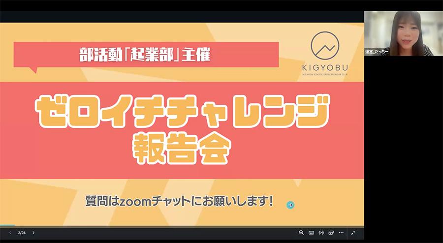 7月の起業部総会では「ゼロイチチャレンジ報告会」と「BLP生徒の活動報告」を行いました。