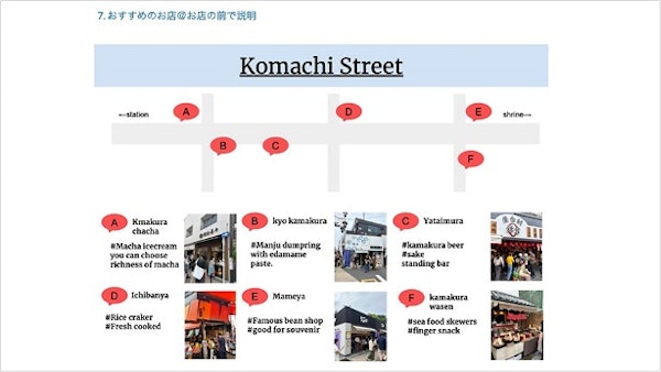 研修では、ツアー当日に紹介する鎌倉のおすすめの店や観光スポットを記載したガイド用マニュアルをもとに、「どのように説明すれば外国人旅行者に楽しんでもらえるか」といった、ガイドのポイントを学びました。
