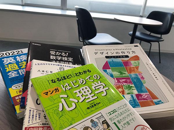 また、置かれている書籍は、英検対策や数検対策、Adobe製品の練習用の書籍など、資格検定・スキル向上に役立つ本だけではありません。漫画でわかる心理学や経済学などの入門書や、ビジネス書などもあります。