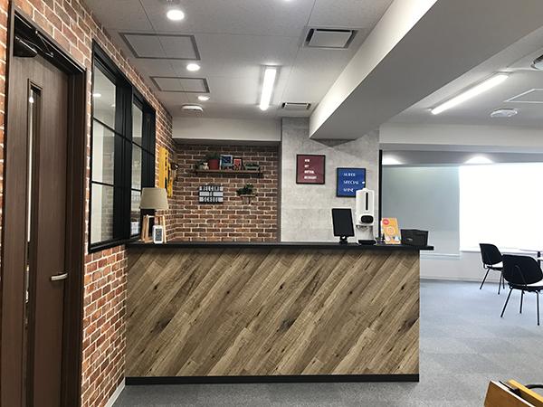 まず、入って目の前に見えるのがカウンターです。右側には職員室、奥には来客用の面談室があります。
