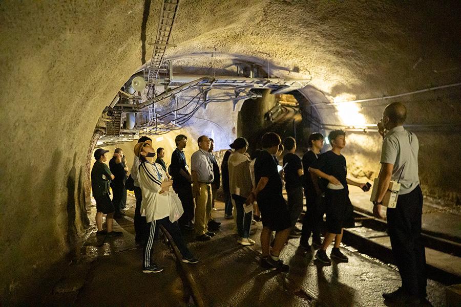 坑道展示エリアではガイドの話を聞きながら、当時の現場の雰囲気を味わいました。