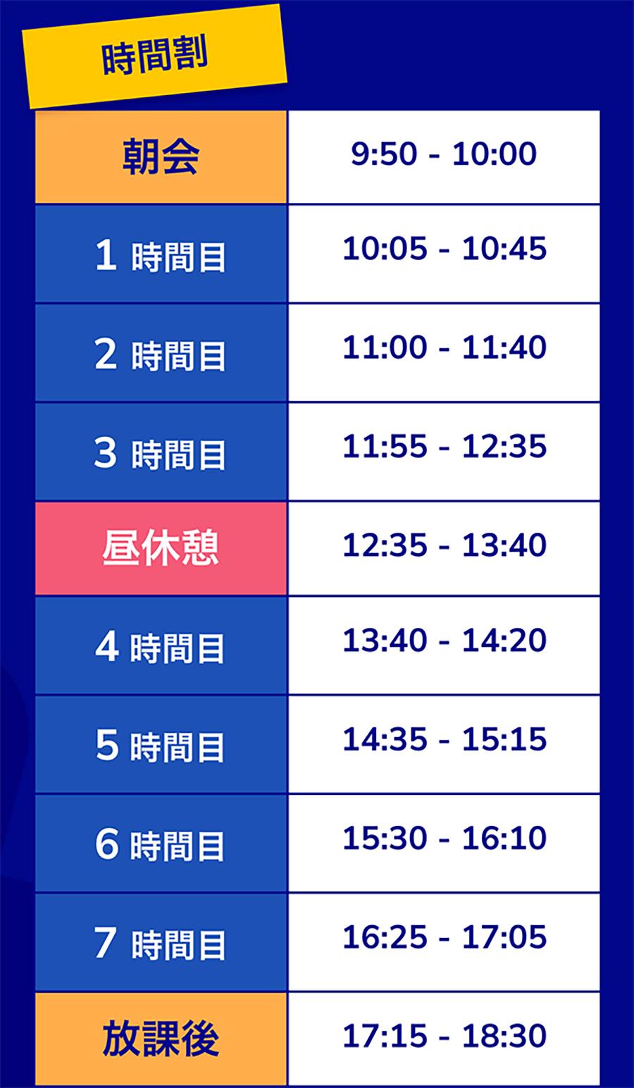細かな時間割は生徒ごとに異なりますが、スケジュールの一例を紹介します。