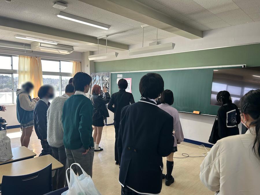 駅からバスで本校まで移動した後、まずは教室で日常風景の撮影を行います。踊ってみたのみの参加を選択した生徒は、空いたこの時間に振り付けの確認を行いました。