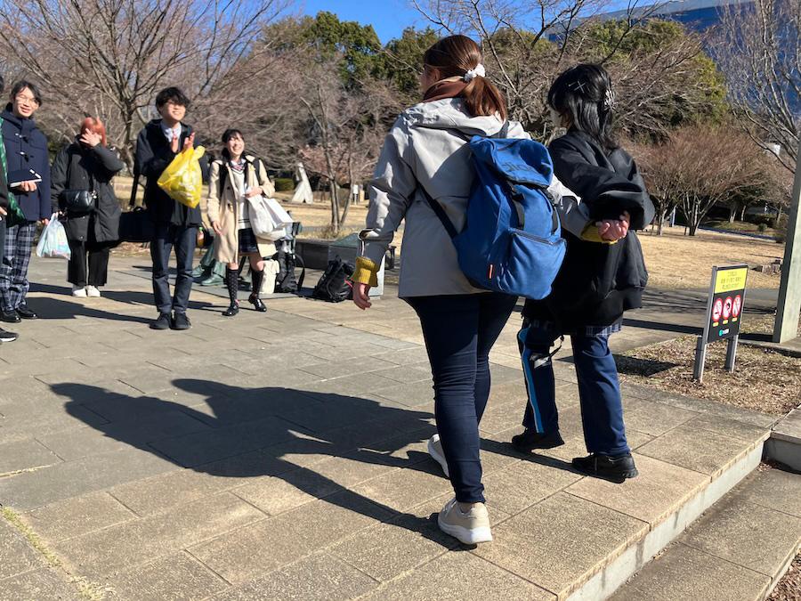 撮影中、何度か空き時間もありました。午前の空き時間には、前述の通り振り付けの確認をして、午後の空き時間には、昼食後に交流会を実施しました。交流会の内容は「映えと青春をテーマにした写真を撮影する」というものです。数人のグループに分かれて校内を散策しながら撮影スポットを探します。