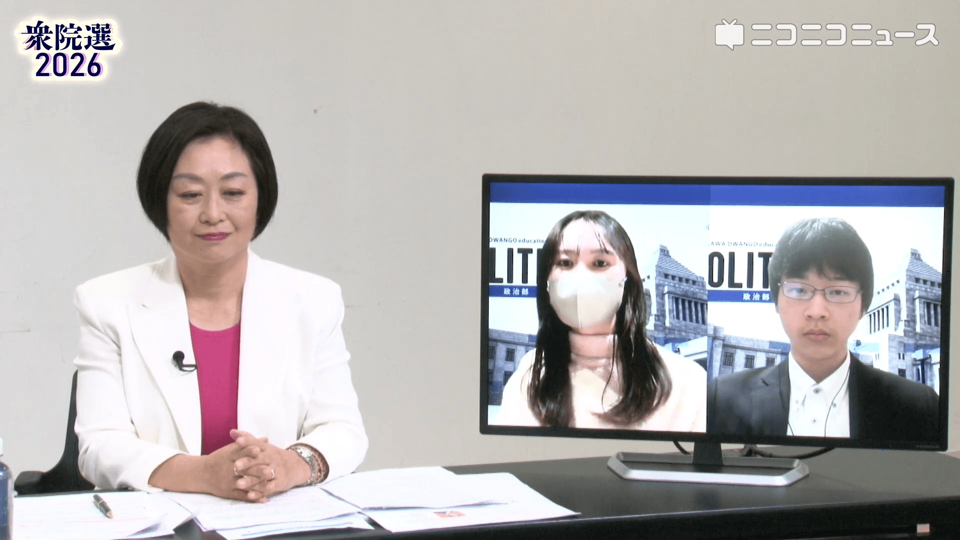 番組には、インタビュアーの七尾功さん(ニコニコニュース政治担当プロデューサー)とともに、大西郁杜さん(S高等学校・1年/政治部6期生)、鈴木理緒さん(S高等学校・1年/政治部6期生)が出演し、消費税廃止を掲げる狙い、選挙制度改革について、他党との協調姿勢についてなど、さまざまなテーマでれいわ新選組・くしぶち万里共同代表と直接意見交換しました。