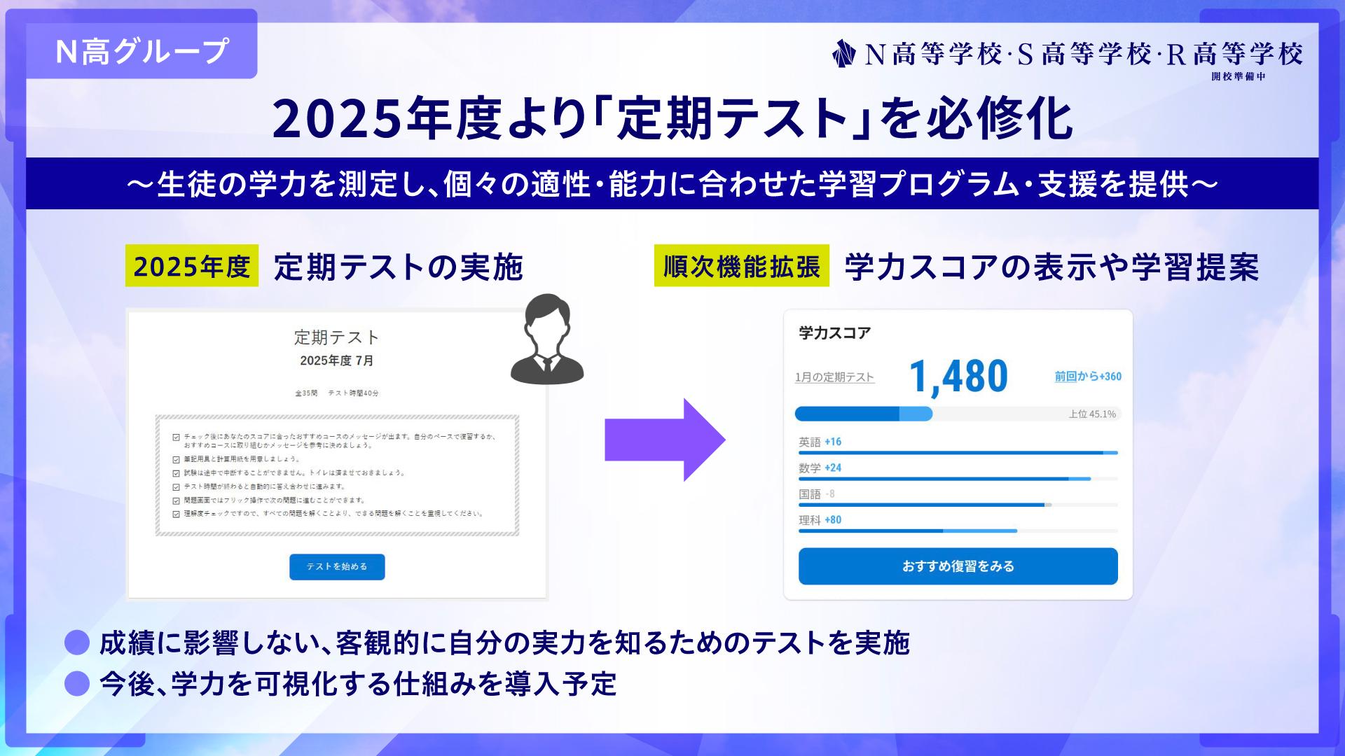定期テストはN高グループの2025年4月入学生より必修化し、実施します。2025年度は定期テストの結果を基に、メンターと生徒が学習の振り返りを行う機会を増やし、生徒個々の適性・能力に合った学習サポートを行っていきます。また、今後は学習アプリで、定期テストの結果を基にした学力スコアの表示、復習に必要な学習教材の提案などができるよう、アップデートを進めていく予定です。これにより、科目ごとの学力・習熟度を生徒自身も把握することができ、教職員も生徒一人ひとりの適性・能力に合わせた学習プログラム・支援に取り組むことが可能となります。