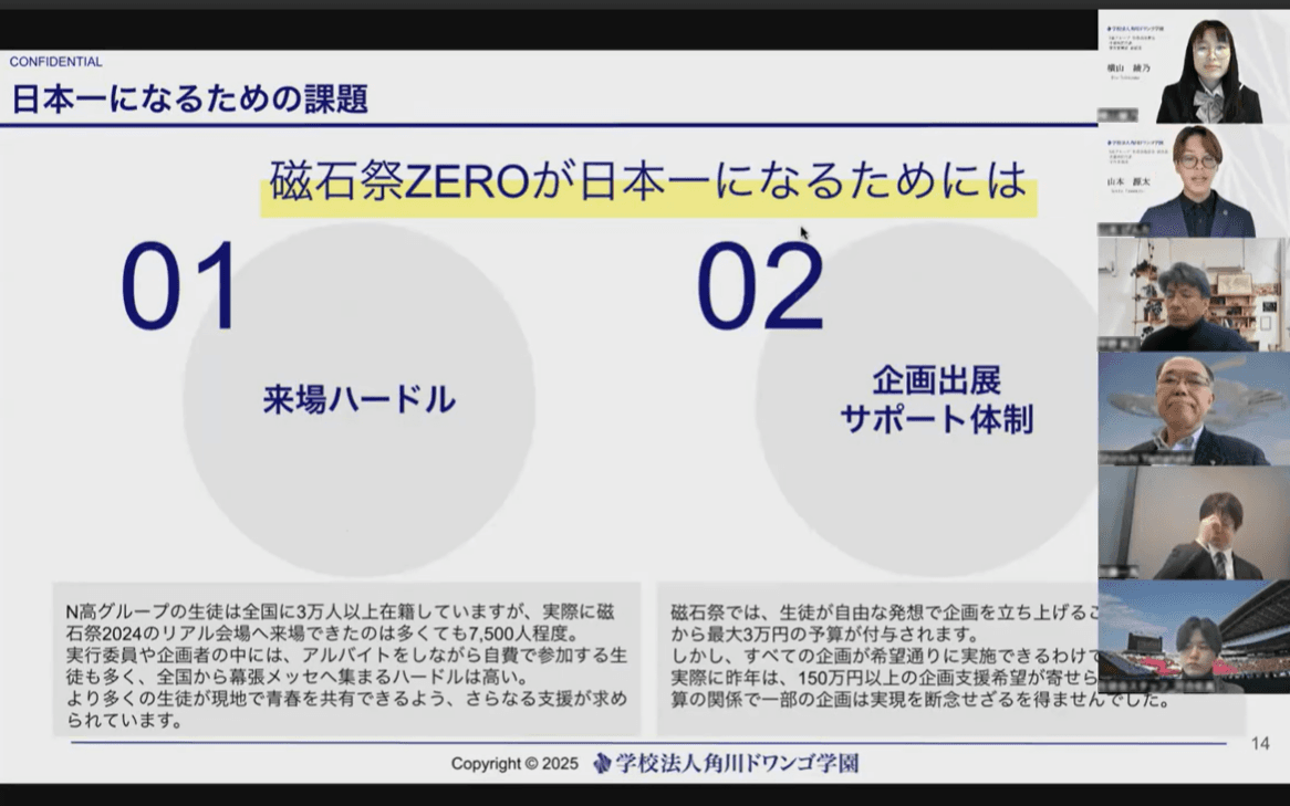 N高グループ生徒会は、全国各地に生徒が在籍し生徒数が3万名を超える中、交通費の負担等リアル会場への来場ハードルが高いことに課題を感じ、磁石祭ZEROをきっかけにより多くの生徒がリアルで活動・交流できるよう、自ら運営予算の拡大に向けて活動しました。